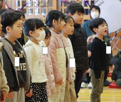 まずは、1年生の発表です。1年生は、ペアの6年生へのあふれる感謝を一人ずつ言葉にして伝えました。一緒に遊んでもらったことや給食の準備を手伝ってもらったこと、そうじを教えてもらったこと等、感謝の言葉は尽きません。1年生のかわいらしい発表に6年生も思わず「かわいい。」の言葉がこぼれます。